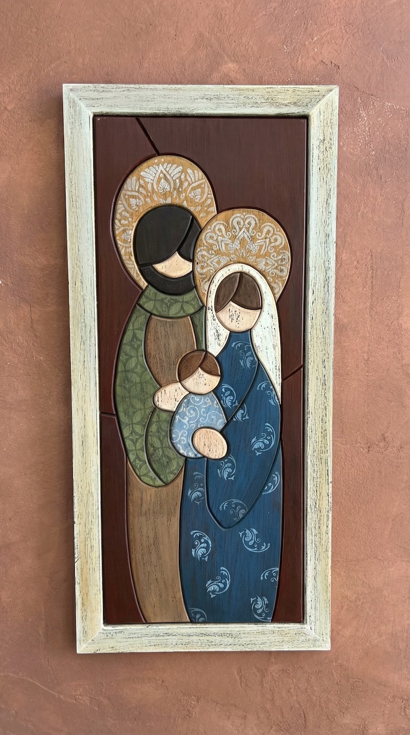 Un hermoso cuadro en piezas de madera de la Sagrada Familia en tonos otoñales.