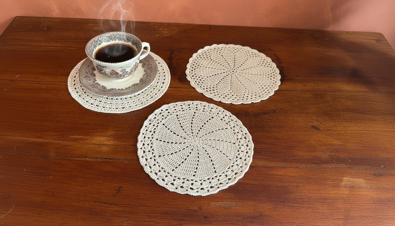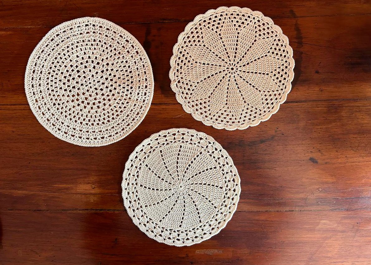 Juego de 6 tapetes redondos color perla, tejidos a mano, con 2 unidades de cada modelo. Su diseño delicado y tono neutro aportan armonía y estilo a tu mesa, mientras protegen tus superficies con un acabado artesanal.