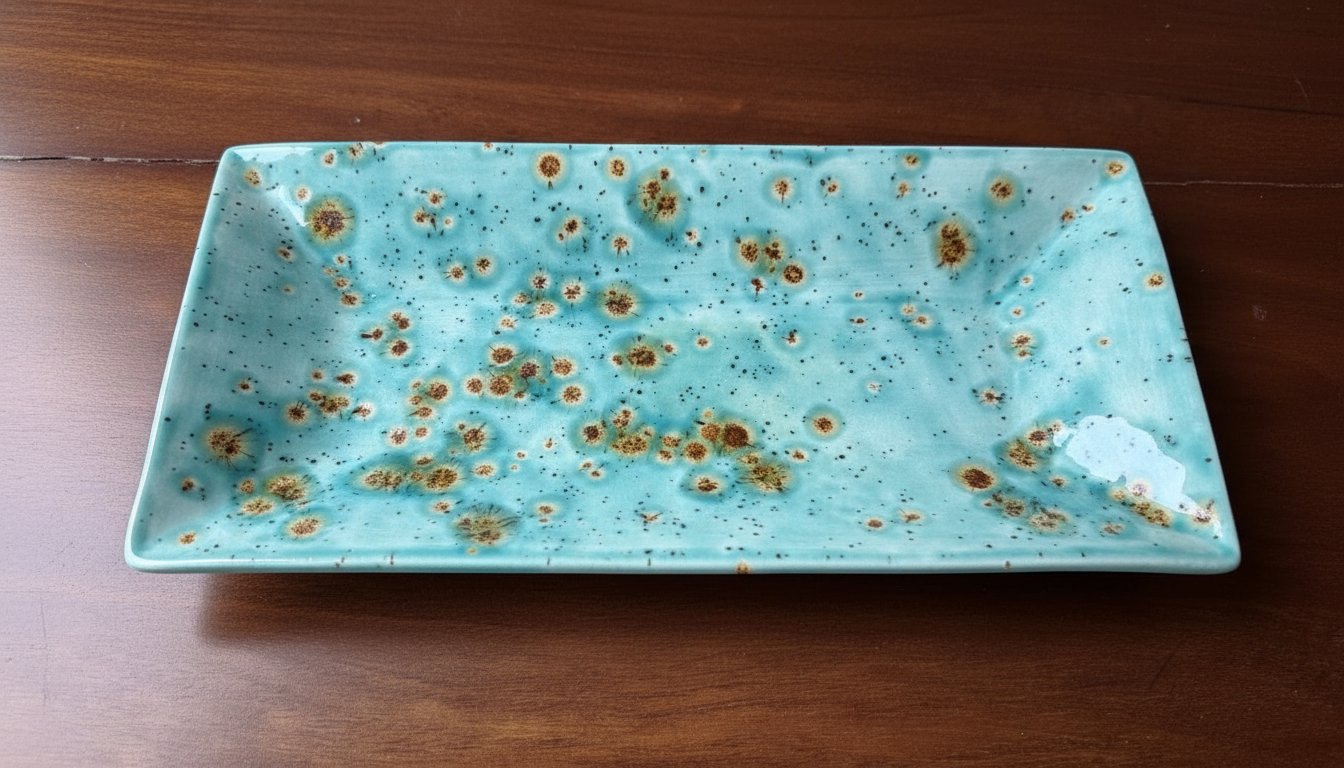 Vajilla de sushi, pintada a mano con diseño original en tono jade. Para 6 personas incluye: plato rectangular, platillo pequeño, porta palillos, palillos, jarrita para salsa, vasito para salsa y una fuente grande.